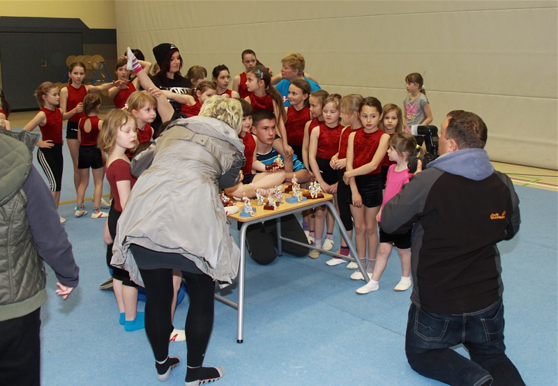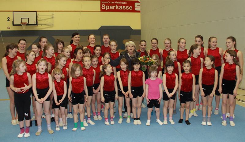 Nach einer längeren Behandlungspause leitete Regine erstmals wieder das Training. Die Akrobaten begrüßten Sie mit einem Blumenstrauß und sangen noch nachträglich "Happy Birthday..."
