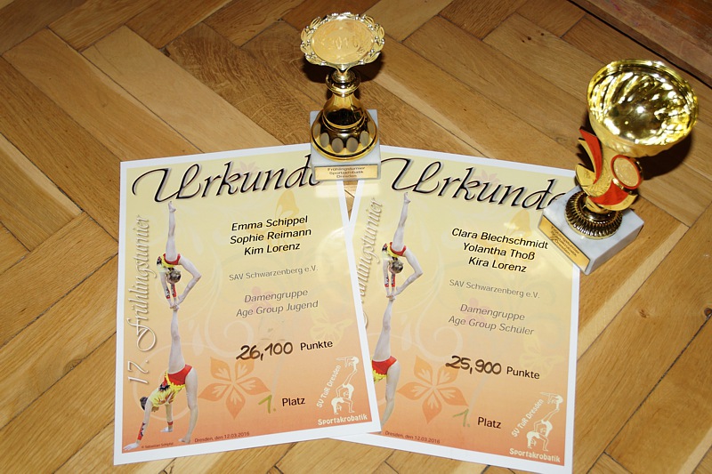In der Disziplin Damengruppen Jugend überzeugten Emma Schippel, Kim Lorenz und Sophie Reimann erneut mit einer sehr sauberen Balance das Kampfgericht. Die Mädels erkämpften mit tollen 26,100 Punkten den Sieg und den Pokal des Frühlingsturniers.