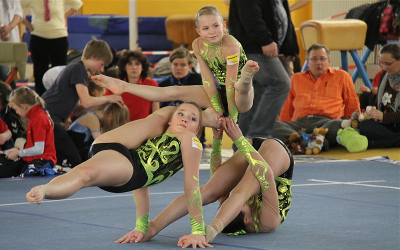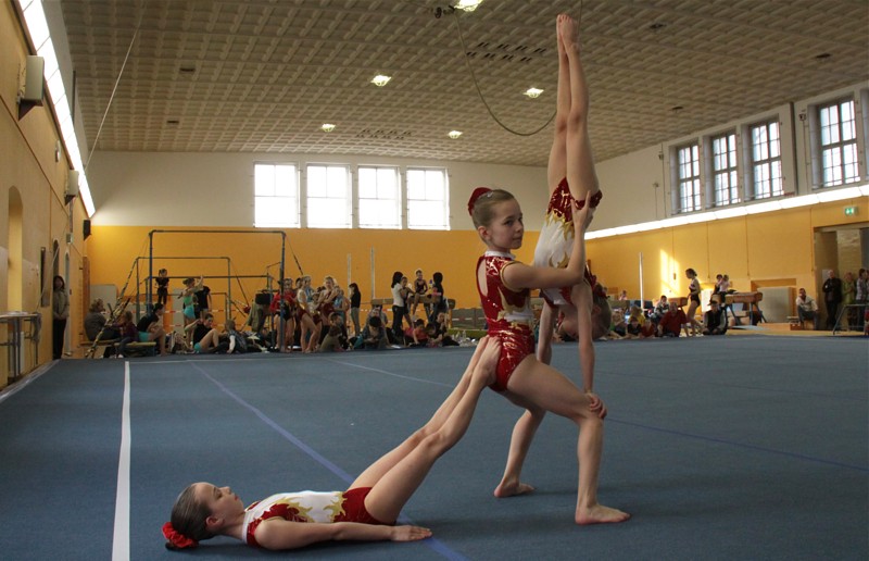 Neun starke Damengruppen des Schüler-Nachwuchses kämpften um den Sieg beim Dresdener-Frühlingsturnier. Unser neu formiertes Trio mit Stefanie Sandig, Annika Richter und Clara Blechschmidt erkämpfte die beste Technik und Artistiknote, mussten sich aber in der Schwierigkeit den Mädels vom Akrobatk- Team Niesky beugen. Über den sensationellen 2. Platz freuten sich alle.
