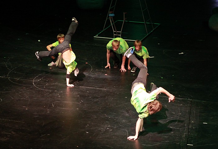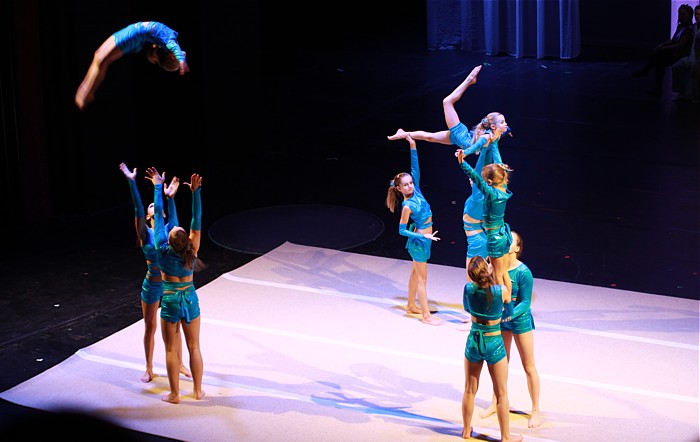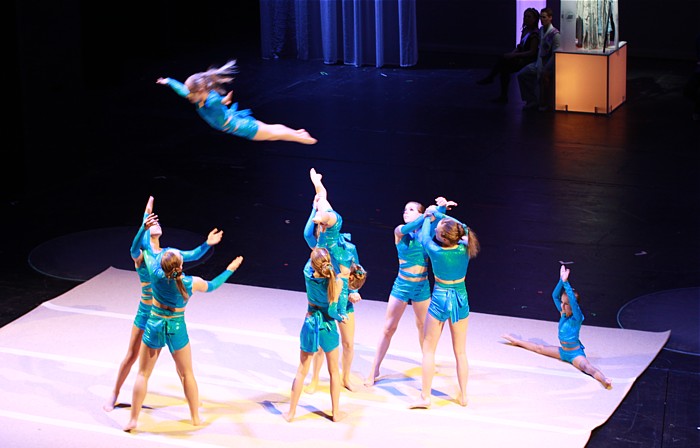 Da die Hebungen und Würfe der Sportakrobatik recht gut zum Thema passen, war es unsere Aufgabe, das Element “Luft” darzustellen.