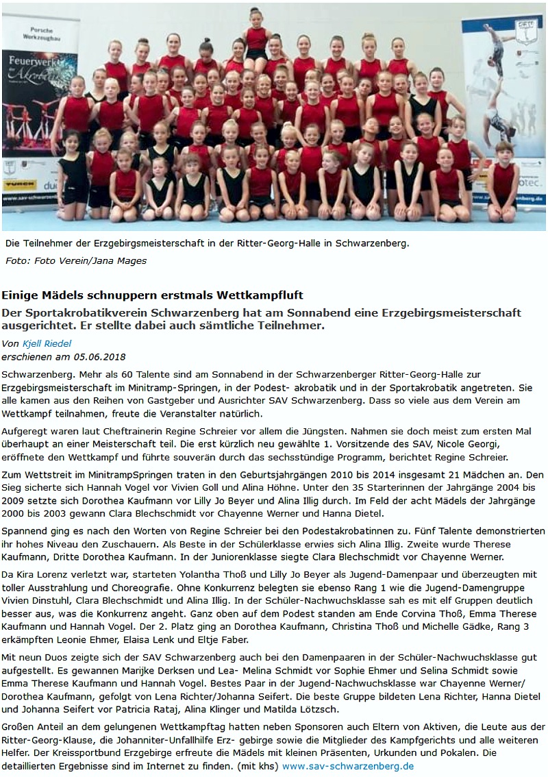 Am 2. Juni führte der SAV Grünhain Schwarzenberg die Erzgebirgsmeisterschaften in den Disziplinen Minitramp, Podestakrobatik sowie in der Sportakrobatik durch.