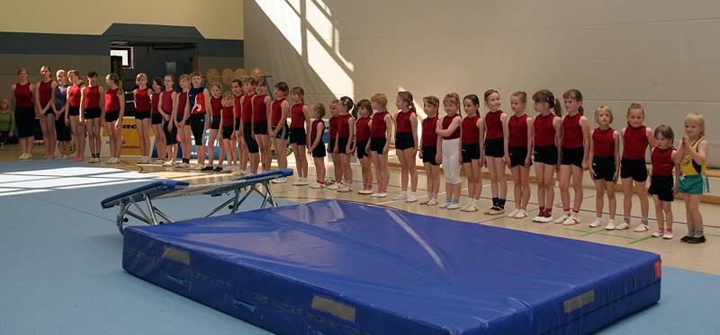 Am ersten Wettkampftag stand für 35 Sportakrobaten von 4 bis 18 Jahren des (Alt-)Landkreises Aue- Schwarzenberg das Minitrampspringen auf dem Programm. Je nach Leistungsklasse wurden unterschiedlich schwere Sprünge gezeigt. Auch in diesem Jahr war es für viele der kleinen Nachwuchsakrobaten des SAV, die erste Möglichkeit, einen Wettkampf zu bestreiten. Entsprechend groß war die Aufregung.