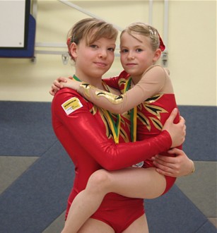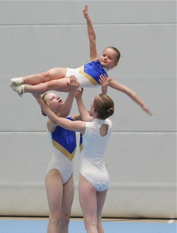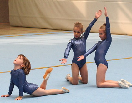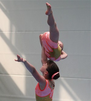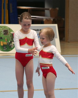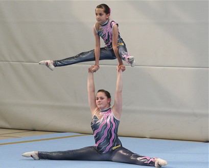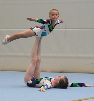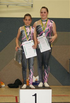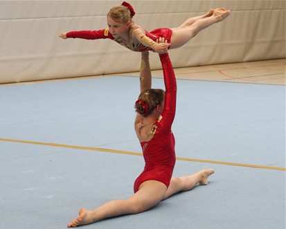 Eine schwierige Balanceübung zeigten Theresa Fritzsch und Kim Lorenz. Zum ersten Mal wagten die Mädels den Handstand auf den gestreckten Armen. Leider klappte er diesmal noch nicht 100-prozentig. Tolle 8,425 Pkt. und Silber war der Lohn für ihr Risiko.
