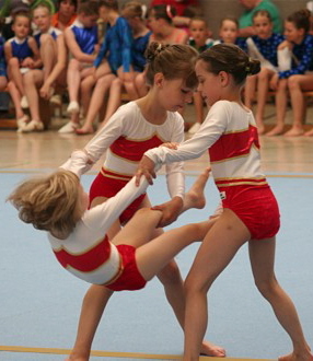 Emotional bewegt waren alle, als unsere tolle Damengruppe der Juniorenklasse Michelle Pötzsch, Patricia Pötzsch und Jessica Fugmann zum letzten Mal ihre wunderschöne Balancedarbietung mit Höchstschwierigkeiten vor den anwesenden Eltern und Großeltern zeigte. Mit der Tageshöchstnote von 9,175 Pkt. erturnten sie den Pokal der Kinder und Jugendspiele 2009. Vielen fällt der Abschied schwer, wir werden Michi vermissen.