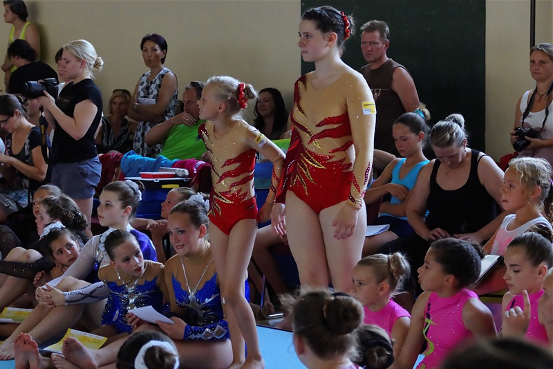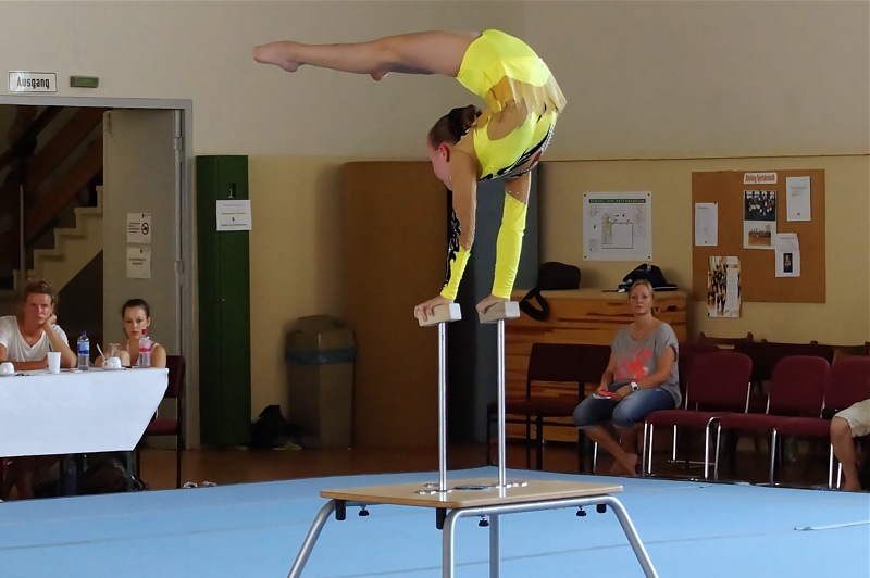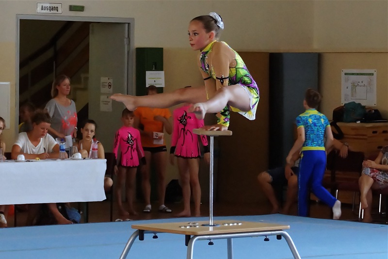 Einen bemerkenswerten Einstieg in der Disziplin Podestakrobatik hatte mit 23,850 Punkten Sophie. Sie zeigte eine sehr schöne Übung und wurde mir 23,850 Punkte vierte vor ihrer Teamkollegin Dorothea Kaufmann, die ebenfalls zum ersten Mal in dieser Disziplin allen auf der Matte stand und die Feuertaufe bestand.