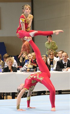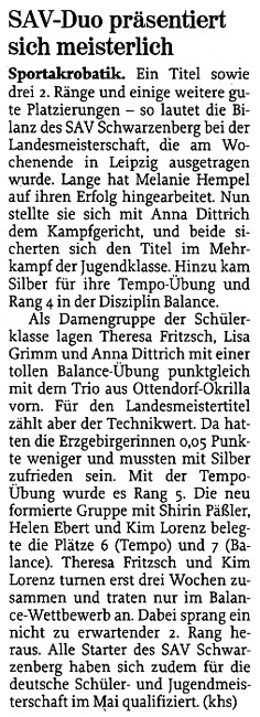 Theresa und Kim trainieren erst seit drei Wochen gemeinsam. Auch deshalb stellten Sie sich nur mit der Balance dem Kampfgericht und erkämpften einen nicht zu erwartenden 2.Rang (25,00 Pkt.). Ein toller Einstieg des neuen Duos vom SAV! Landesmeister bei den Schüler-Damenpaaren wurde das Duo vom SC Riesa mit 26,60 Pkt.